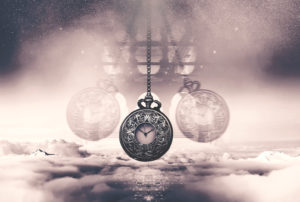 Hypnotising watch on a chain swinging above clouds. Time concept