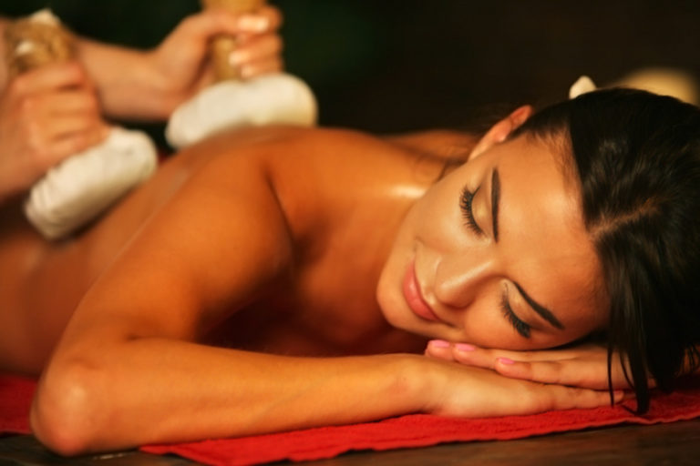 Young woman lying on wooden spa bed. Poultice hot herbal massage in spa salon.